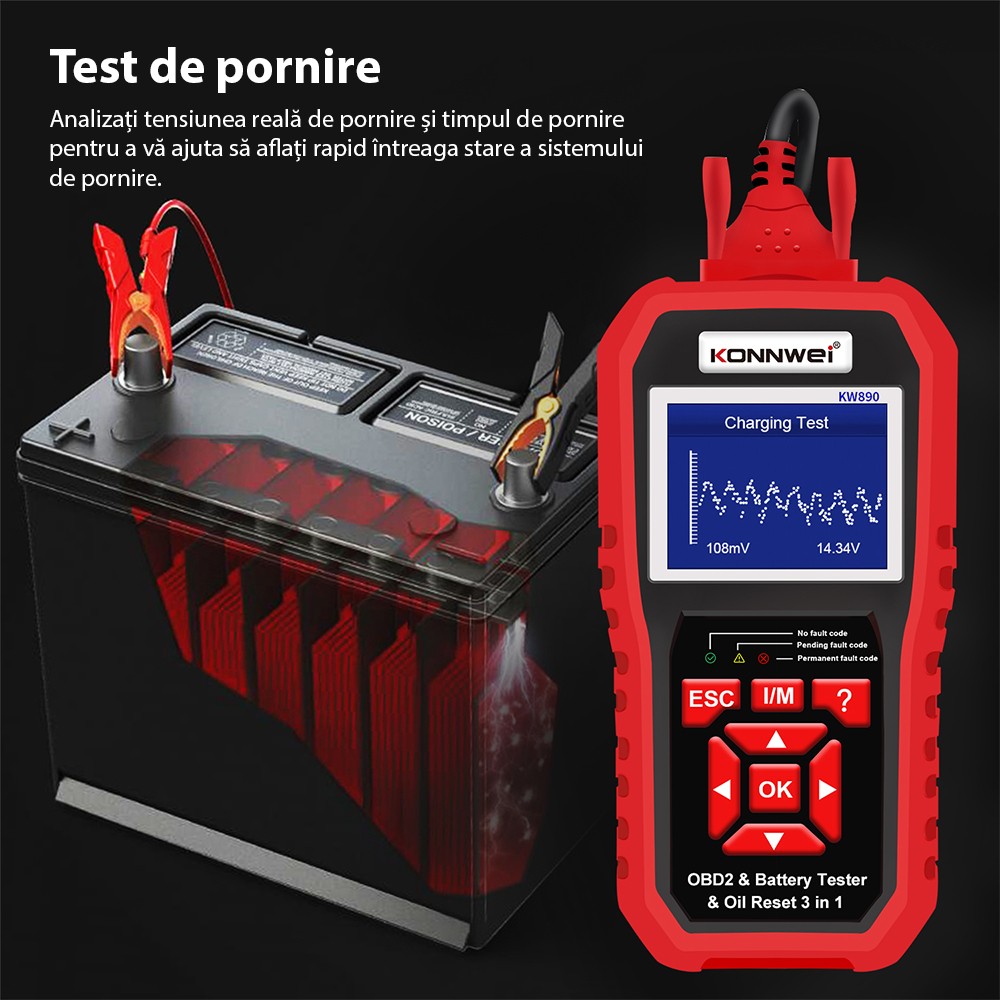 Alimentare duala: de la portul OBD2 sau direct de la baterie prin cablurile cu cleme incluse – util la testarea bateriei pe vehicule fara contact pus.