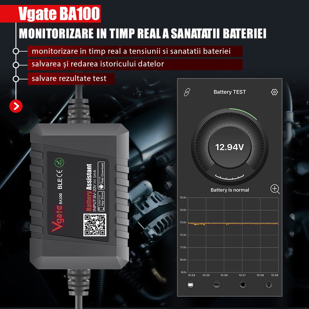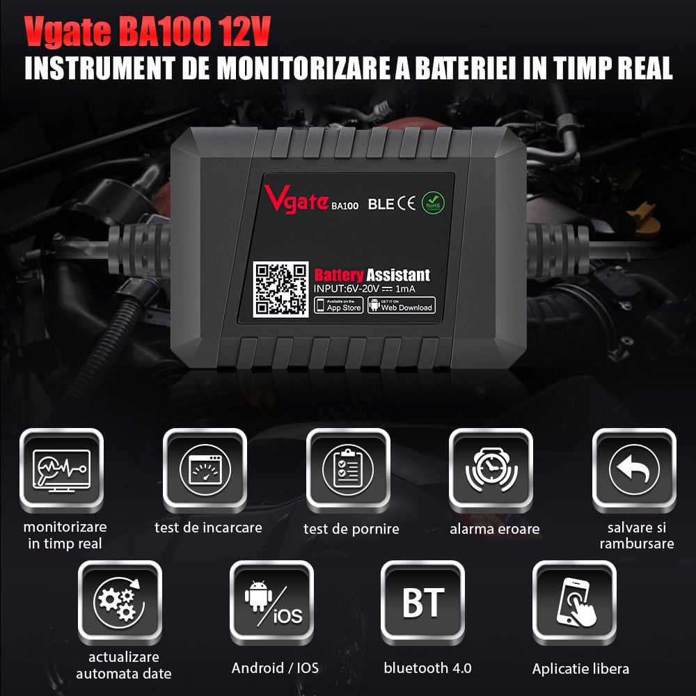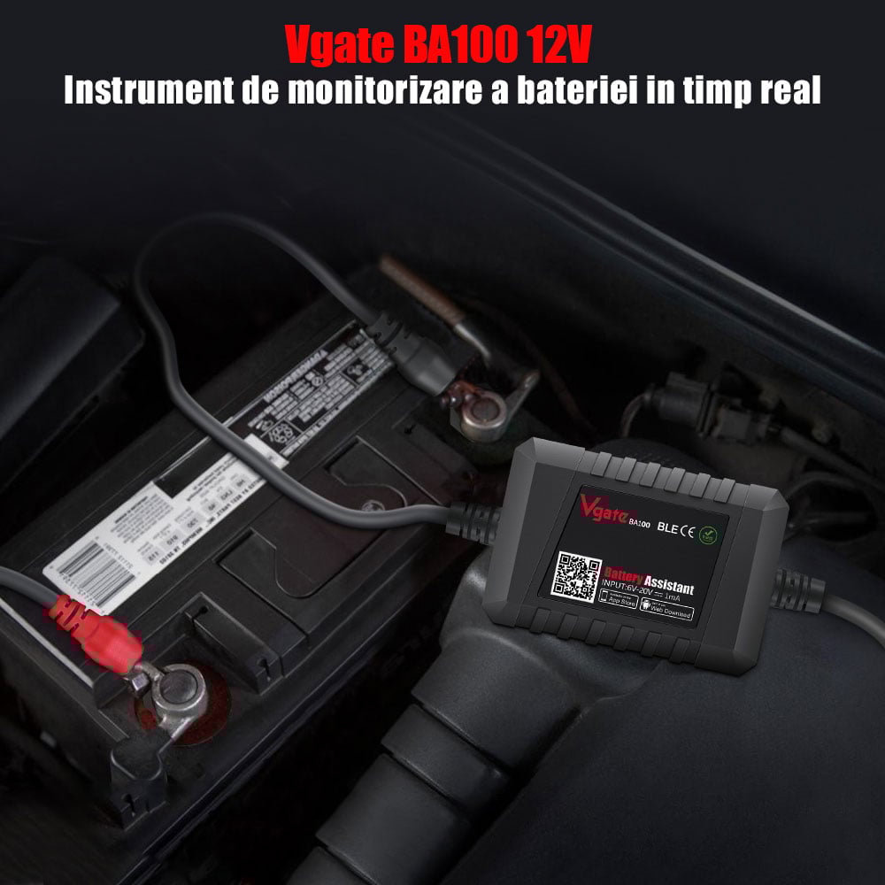 Modulul pentru monitorizare a bateriei auto Vgate BA100 permite monitorizarea in timp real a performantelor acumulatorului de 12V al autoturismului. Se instaleaza o aplicatie pe telefonul mobil care se conecteaza prin Bluetooth 4.0 si permite vizualizarea informatiilor monitorizate. Modulul permite si stocarea informatiilor in memoria sa, apoi la conectarea cu telefonul mobil (sau tableta) informatiile din trecut se descarca si pot fi vizualizate in aplicatie. Se stocheaza pana la 31 zile in memorie.