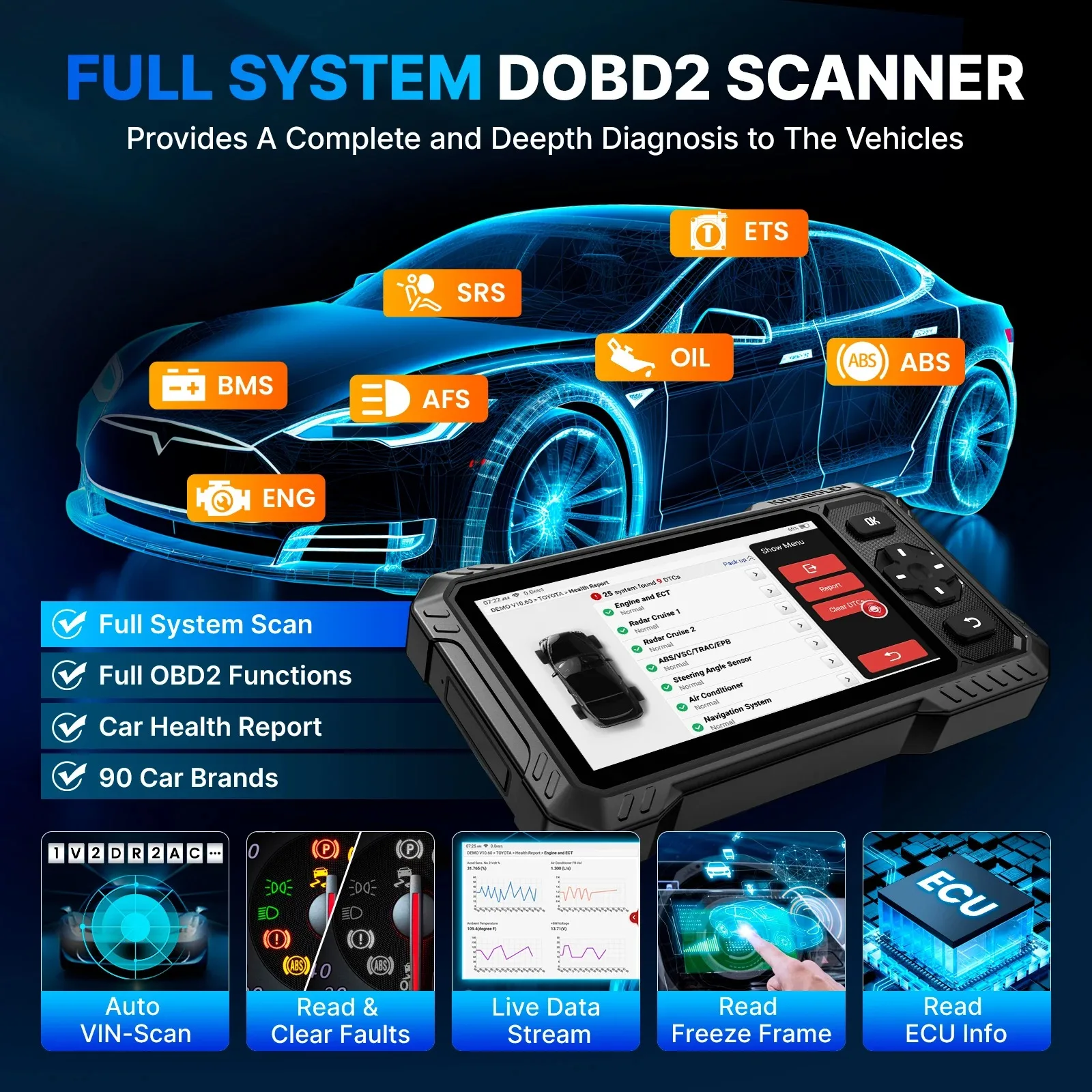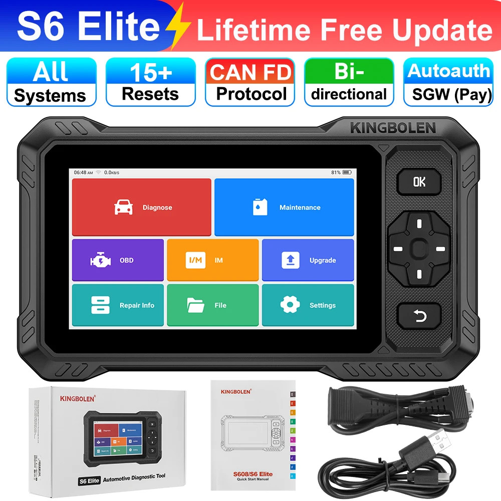 KINGBOLEN S6 Elite 2025 este un tester de diagnoza auto tip tableta, pentru utilizare multimarca. Il conectezi la masina prin cablu OBD2 si lucrezi rapid pe toate modulele disponibile. Il folosesti pentru diagnoza, teste active, intretinere si resetari, plus rapoarte pentru client sau pentru istoricul tau.