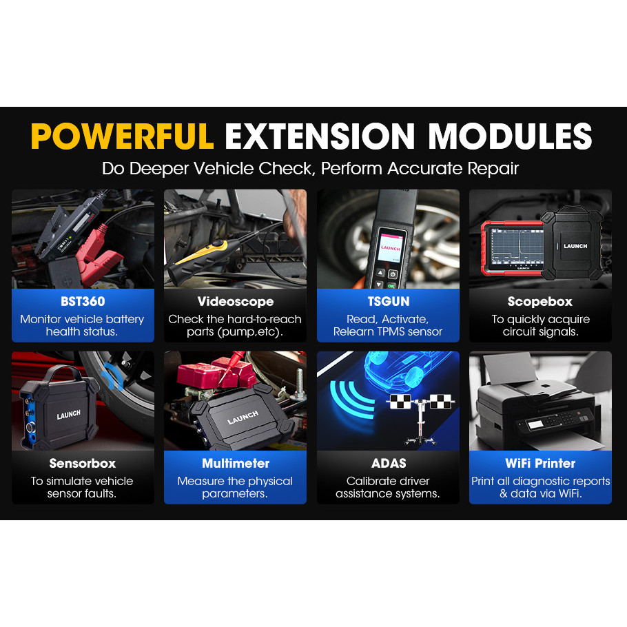 Poti extinde sistemul, in functie de ce ai nevoie: modul programare chei X-PROG3, pistol TPMS, videoscop VSP600, imprimanta pentru rapoarte, tester baterie BST360, oscilloscope si sensor box, plus functii ADAS cu echipamente dedicate.