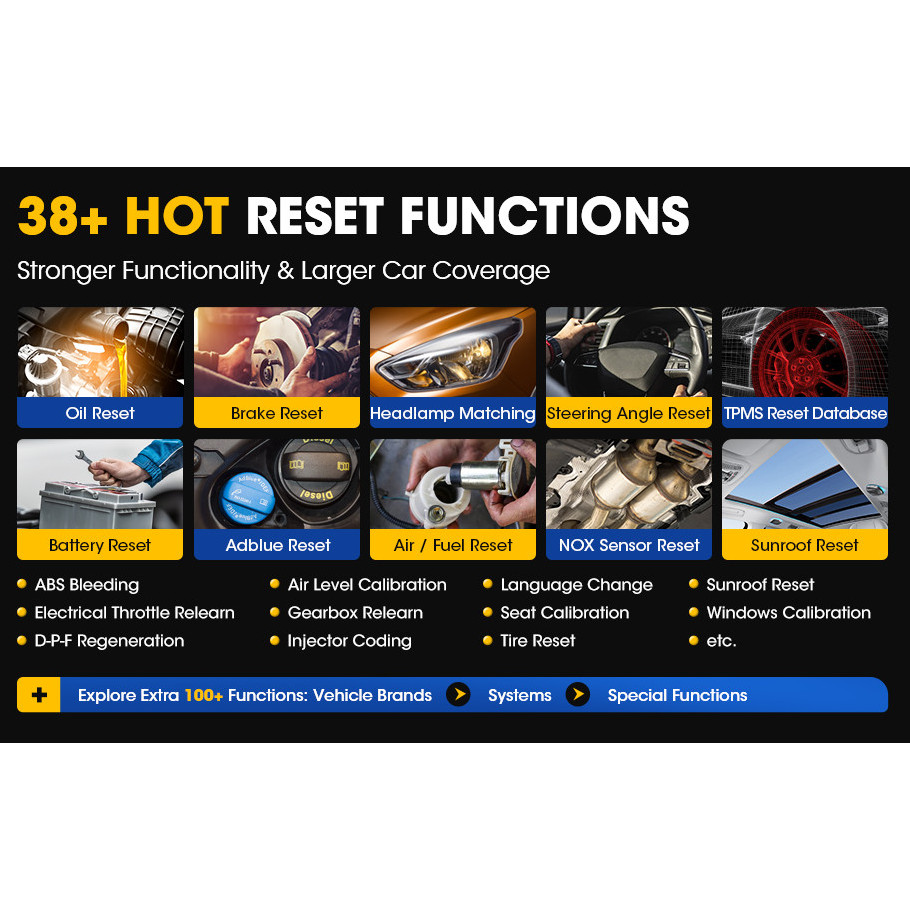 Functiile afisate in aplicatie si in tester difera de la o masina la alta. Disponibilitatea depinde de marca, model, anul de fabricatie, motorizare, nivelul de echipare si calculatorul masinii. Unele functii tin si de protocoalele suportate, de sistemele instalate pe vehicul si de modul in care producatorul a implementat diagnoza. De aceea, nu toate functiile sunt disponibile pe toate masinile, iar anumite optiuni pot aparea doar la modele compatibile.