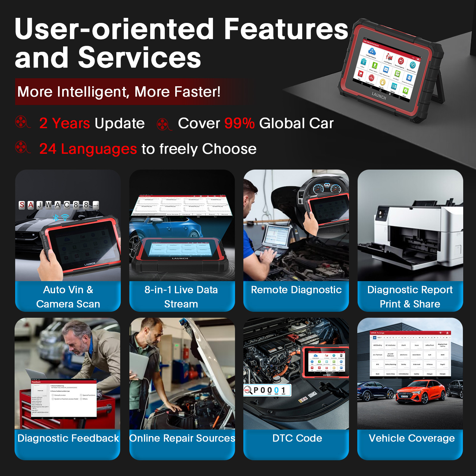 LAUNCH X431 PRO ELITE este un tester de diagnoza profesional, tip tableta, pentru diagnoza completa pe majoritatea marcilor auto. Lucrezi rapid pe toate modulele importante si faci teste active, resetari de service si functii avansate, direct din interfata lui.